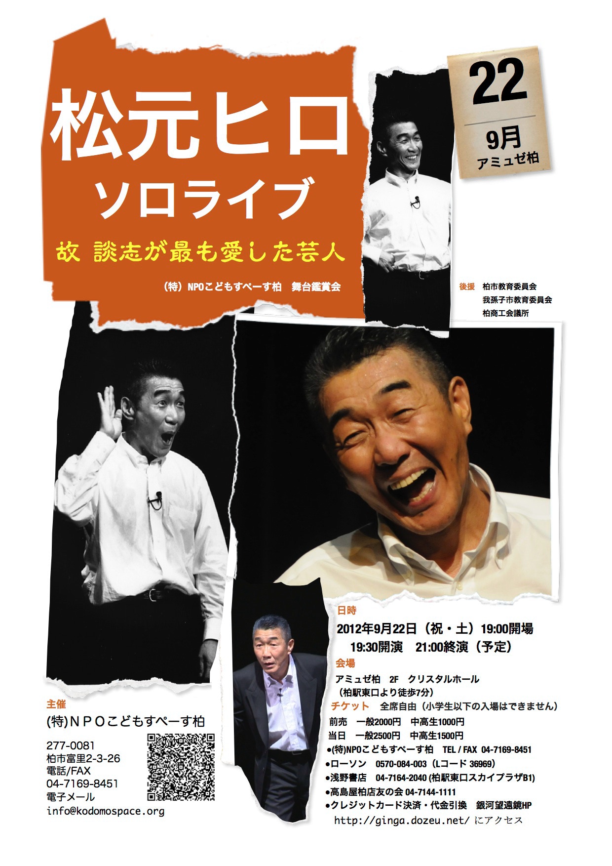 私共、来る2012年9月22日(秋分の日・土曜日)19時30分より、「松元ヒロソロライブ」をアミュゼ柏クリスタルホールにて開催いたします。